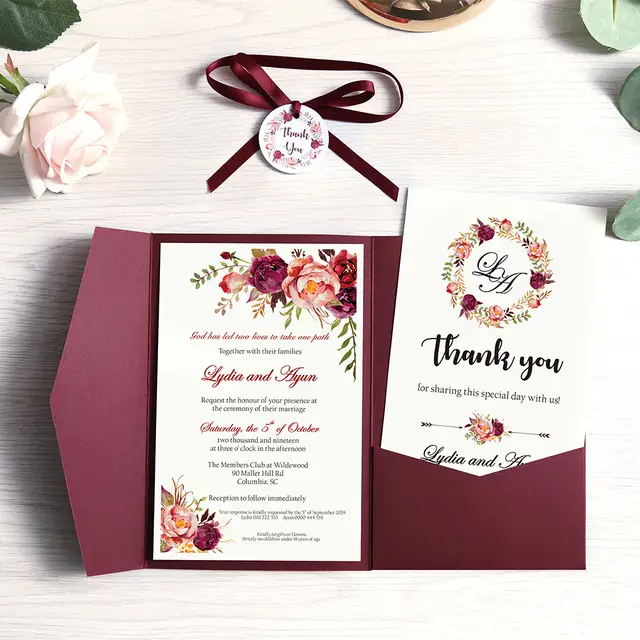 Us 60 0 50pcs Wedding Invitations Burgundy Blue Pink Pocket Greeting Cards With Envelope Customized Party With Ribbon And Tag In Cards Invitations