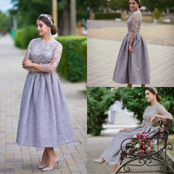 2020 Grey Mother Of The Bride Dresses With Cape 3 4 Long Sleeves Knee Length Prom Dress Lace Appliqued Formal Wedding Guest Gowns Mother Of The Bride