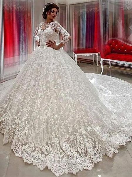Vintage 2019 Full Lace Ball Gown Wedding Dresses Dubai Arabic Style Long Sleeve Sheer Neck Appliques Long Church Bridal Gowns Formal Bc2037 Wedding