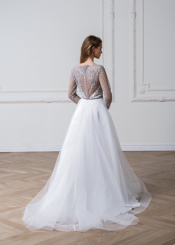 Bohemian Long Sleeve Lace Wedding Dress Tulle Wedding Skirt Bridal Dresses Lace Top Wedding Dress Belt Gray Romantic Wedding Dress Ivory