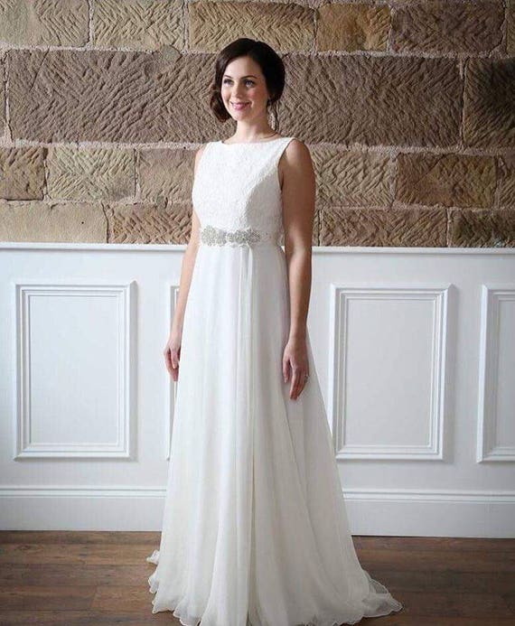 Ivory Chiffon Lace Wedding Dresses With Champagne Belt Long Bridal Gowns Handmade Wedding Gowns