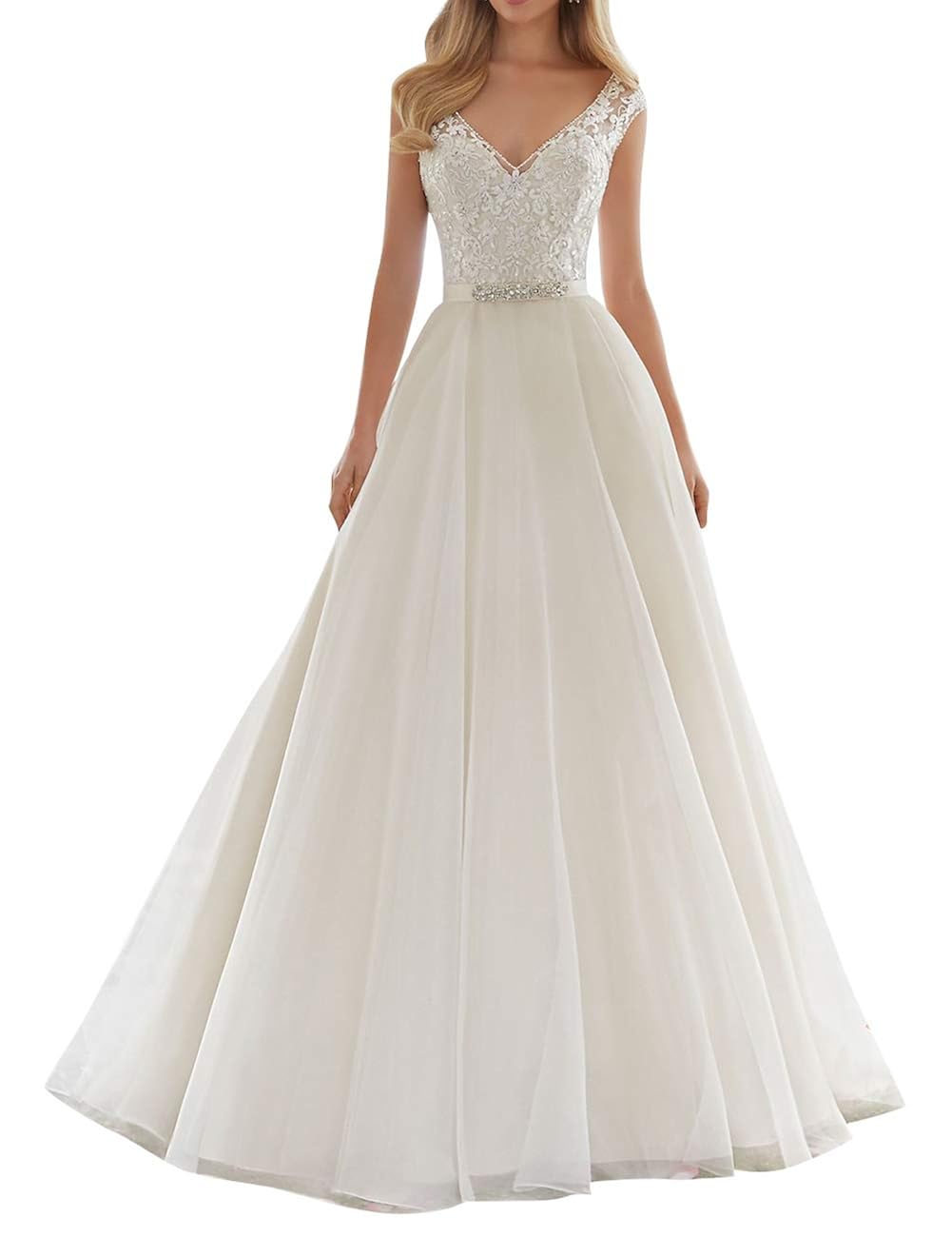 Princess A Line V Neck Open Back Tulle Lace Wedding Dress