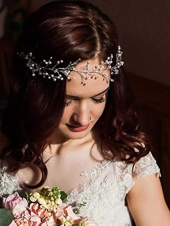 Aoprie Bridesmaid And Flower Hair Accessories Wedding Headband 19 7 Inches Crystal Pearl White Silver Headpieces Bridal Hair Vines For Women