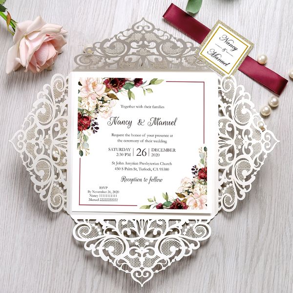 Luxury Champagne Glitter Laser Cut Wedding Invitation With Burgundy Ribbon And Tag Flower Personalized Print Engagement Invites W Envelopes Mexican